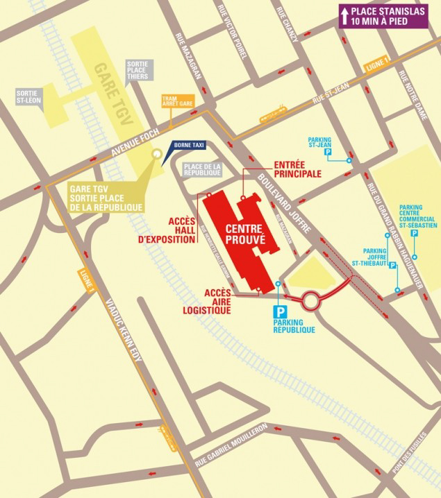 Situé en plein centre-ville de Nancy, le Centre des Congrès Prouvé est facilement accessible par tous les modes de transport. Doté d’un parking public de 455 places, il jouxte la gare TGV et la plateforme d’interconnexion des réseaux de transports publics.